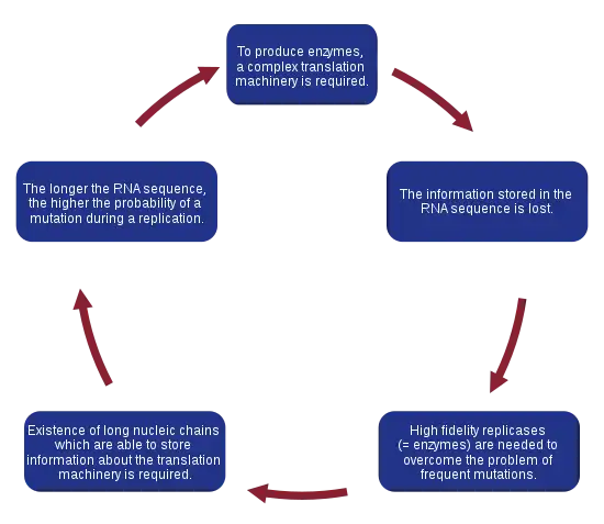 According to current estimations, the maximum length of a replicated chain that can be correctly reproduced and maintained in enzyme-free systems is about 100 bases, which is assumed to be insufficient to encode replication machinery. This observation was the motivation for the formulation of the hypercycle theory.[23]