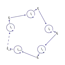 Analysis of potential molecules that could form the first hypercycles in nature prompted the idea of coupling an information carrier function with enzymatic properties. At the time of the hypercycle theory formulation, enzymatic properties were attributed only to proteins, while nucleic acids were recognized only as carriers of information. This led to the formulation of a more complex model of a hypercycle with translation. The proposed model consists of a number of nucleotide sequences I (I stands for intermediate) and the same number of polypeptide chains E (E stands for enzyme). Sequences I have a limited chain length and carry the information necessary to build catalytic chains E. The sequence Ii provides the matrix to reproduce itself and a matrix to build the protein Ei. The protein Ei gives the catalytic support to build the next sequence in the cycle, Ii+1. The self-replicating sequences I form a cycle consisting of positive and negative strands that periodically reproduce themselves. Therefore, many cycles of the +/− nucleotide collectives are linked together by the second-order cycle of enzymatic properties of E, forming a catalytic hypercycle. Without the secondary loop provided by catalysis, I chains would compete and select against each other instead of cooperating. The reproduction is possible thanks to translation and polymerization functions encoded in I chains. In his principal work, Manfred Eigen stated that the E coded by the I chain can be a specific polymerase or an enhancer (or a silencer) of a more general polymerase acting in favour of formation of the successor of nucleotide chain I. Later, he indicated that a general polymerase leads to the death of the system.[2] Moreover, the whole cycle must be closed, so that En must catalyse I1 formation for some integer n > 1.[1][2]