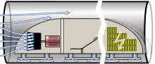 Hyperloop is a proposed high-speed transportation system for both public and goods transport. The idea was picked up by Elon Musk and SpaceX engineers as a means to disrupt a proposed California High-Speed Rail system[1][2] and described as a transportation project involving capsules supported by air-bearings in low-pressure environment inside a tube.[3] Hyperloop systems have three essential elements: tubes, pods, and terminals. The tube is a large, sealed low-pressure system (usually a long tunnel). The pod is a coach pressurized at atmospheric pressure that experiences low air resistance or friction inside this tube[4] using magnetic propulsion (in the initial design, augmented by a ducted fan). The terminal handles pod arrivals and departures. The Hyperloop, in the initial form proposed by Musk, differs from vactrains by relying on residual air pressure inside the tube to provide lift by aerofoils and propulsion by fans;[5] however, many subsequent variants using the name "Hyperloop" have been relatively traditional vactrains.