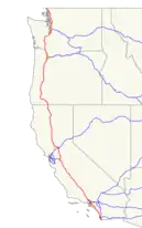 The route suggested in the 2013 alpha-level design document was from the Greater Los Angeles Area to the San Francisco Bay Area. That conceptual system would begin around Sylmar, just south of the Tejon Pass, follow Interstate 5 to the north, and arrive near Hayward on the east side of San Francisco Bay. Several proposed branches were also shown in the design document, including Sacramento, Anaheim, San Diego, and Las Vegas.[5]