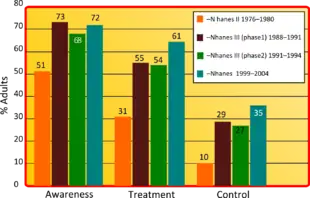 - ↑ Ostchega Y, Dillon CF, Hughes JP, Carroll M, Yoon S (July 2007). "Trends in hypertension prevalence, awareness, treatment, and control in older U.S. adults: data from the National Health and Nutrition Examination Survey 1988 to 2004". Journal of the American Geriatrics Society. 55 (7): 1056–1065. doi:10.1111/j.1532-5415.2007.01215.x. PMID 17608879. S2CID 27522876.