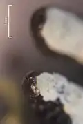 Rhizines are root-like attachment organs on the lower surface of a lichen thallus, made of elongated strands of hyphae; a shorter version of this attachment organ is called a hapter. Although many recent lichen floras and manuals describe Hypogymnia as lacking rhizines, a 2015 study challenges the universality of this assertion. In the study, researchers studied a large number of Hypogymnia collections, representing 72 species as well as 64 type specimens. They found that rhizines and hapters were occasionally present on the lower surface of 35 species. Two types of attachment organs are found: slender rhizines with fine and tapering tips (found in H. krogiae and H. subfarinacea), and the more common hapters, which are thick with broken tips. Both types are dark brown to black and usually the same colour as the lower surface. In all cases where these attachment organs are found, however, they are few in number and are sparsely distributed on the lower thallus surface.[11]