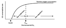 A fish's hypoxia tolerance can be represented in different ways. A commonly used representation is the critical O2 tension (Pcrit), which is the lowest water O2 tension (PO2) at which a fish can maintain a stable O2 consumption rate (MO2).[2] A fish with a lower Pcrit is therefore thought to be more hypoxia-tolerant than a fish with a higher Pcrit. But while Pcrit is often used to represent hypoxia tolerance, it more accurately represents the ability to take up environmental O2 at hypoxic PO2s and does not incorporate the significant contributions of anaerobic glycolysis and metabolic suppression to hypoxia tolerance (see below). Pcrit is nevertheless closely tied to a fish's hypoxia tolerance,[3] in part because some fish prioritize their use of aerobic metabolism over anaerobic metabolism and metabolic suppression.[4] It therefore remains a widely used hypoxia tolerance metric.[5]