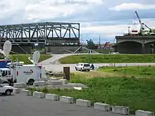 The collapsed span was temporarily replaced by a pair of two-lane bridges manufactured by ACROW, which were rolled onto the existing bridge piers. It went into service on June 19.[31] Inspections on the temporary span near the end of July 2013 uncovered that part of an "L" joint that holds the asphalt in place between the temporary bridge and permanent roadway had come loose. The right lane of the bridge was closed for about two hours while crews welded the joint back into place and spread new asphalt.