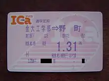 ICa (アイカ, Aika) is a rechargeable contactless smart card ticketing system for public transport in Kanazawa, Japan, introduced by Hokuriku Railroad (Hokutetsu), from December 1, 2004. The name is the portmanteau of IC and card, as well as ai (love), hoping the card will be loved by users. Just like JR East's Suica or JR West's ICOCA, the card uses RFID technology developed by Sony corporation known as FeliCa. There is a mascot fairy character called ICa-chan (アイカちゃん, Aika-chan).