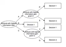 2. Partition ("split") the set into subsets using the attribute for which the resulting entropy after splitting is minimized; or, equivalently, information gain is maximum.