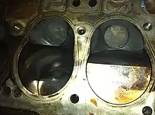 Rover used a more advanced form of IOE engine. It was designed by Jack Swaine in the mid-late 1940s and was in production from 1948 to the early 1990s.[7] Unlike the conventional F-head IOE, this had an efficient combustion chamber designed for good combustion, rather than simple manufacture.[8] The top surface of the block was machined at an angle, with the piston crowns angled in a "pitched roof" to match. At TDC, the piston almost touched the angled inlet valve and provided good 'squish' to the combustion chamber itself, offset to the side by half a cylinder diameter.[8] The resultant combustion chamber shape was a near-ideal hemisphere, although inverted and tilted from the usual "hemi-head" design.[8] The spark plug was centrally mounted and this,[6] together with the turbulence generated by the squish,[8] provided a short flame path.[6] The thinness of the gas layer between piston and inlet valve was so confined as to reduce the risk of detonation on poor fuel, one factor that kept it in service with Land Rover for so long. During the late 1940s and early 1950s when the only petrol available was low octane 'pool' petrol it also allowed Rover to run higher compression ratios than many competitors with the more usual side- or overhead valve designs.[7]