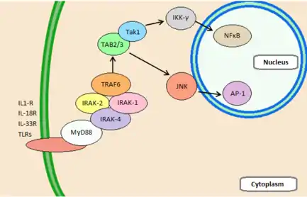 IRAK4 is involved in signal transduction pathways stimulated by the cellular receptors belonging to the Toll/Interleukin-1 receptor superfamily. The Toll-Like Receptors (TLRs) are stimulated by recognition of pathogen-associated molecular patterns (PAMPS), whereas members of the IL-1R family are stimulated by cytokines.[16] Both play an essential role in the immune response. The ligand binding causes conformational changes to the intracellular domain which allows for the recruitment of scaffolding proteins. One of these proteins, MyD88, uses its death domains to recruit, orient, and activate IRAK4. IRAK2 can then be phosphorylated and joins with IRAK4 and MyD88 to form the myddosome complex, which further phosphorylates and recruits IRAK1.[17] The myddosome complex and IRAK1 recruit and activate TNF receptor-associated factor 6 (TRAF6), a ubiquitin protein ligase.[7] TRAF6 can polyubiquitinate IKK-γ as well as itself, which recruits TGF-β activated kinase 1 (TAK1) in order to activate its ability to phosphorylate IKK-β. These pathways both work to degrade IKKγ, which releases NFκB and free it for translocation into the nucleus. Additionally, TAK1 can activate JNK to induce a MAP kinase pathway which leads to AP-1-induced gene expression.[8] Together, AP-1 and NFκB lead to increased cytokine transcription, adhesion molecule production, and release of second messengers of infection.[17]