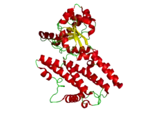 The mouse genome encodes 23 IRGs, several of which have been demonstrated to be widely expressed (liver, heart, spleen, intestine, thymus, lung, testis, kidney, brain, skin) in a number of cell types,[9] and are greatly up-regulated following exposure to the potent immune effector molecule interferon gamma, IFNγ.[10] IRGs are subdivided into two additional classes based on the mode of activity and mechanism. The GSK class (Irga6, Irgb6, and Irgd) are considered the canonical grouping of GTPases, whereas a second grouping of GMS proteins, which have a lysine to methionine mutation in the active site, function to prevent premature activation by associating with the nucleotide binding motif in a manner similar to Guanosine nucleotide dissociation inhibitors (GDI's).[11][12] The subcellular localization of IRGs are variable; Irga6 and Irgm3 are predominantly found within the endoplasmic reticulum, Irgm1 and Irgm2 have been localized to the Golgi apparatus,[13] and at least two IRGs (Irgb6 and Irgd) have been found predominantly within the cytosol.[14] Following cellular entry of Toxoplasma gondii, IRGs can quickly redistribute onto the parasitophorous vacuole membrane (PVM) within 2–30 minutes.[12] The approximate order of decorating the PVM has been defined starting with the loading of Irgb6 and Irgb10 followed by Irga6, Irgd and Irgm2. Faint localization of Irgm3 on T. gondii vacuoles was also reported to occur in rare settings. Activation of the IRGs is thought to follow a GTP dependent cycle of IRG-IRG oligomerization.[15] The loading of the "pioneer" IRGs onto the vacuole is thought to greatly enhance the recruitment of additional IRGs in a cooperative fashion.