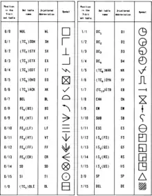 ISO 2047 (Information processing Graphical representations for the control characters of the 7-bit coded character set) is a standard for graphical representation of the control characters for debugging purposes, such as may be found in the character generator of a computer terminal; it also establishes a two-letter abbreviation of each control character.[1] The graphics and two-letter codes are essentially unchanged from the 1968 European standard ECMA-17[2] and the 1973 American standard ANSI X3.32-1973.[3] It became an ISO standard in 1975.[1] It is also standardized as GB/T 3911-1983 in China, as KS X 1010[4] in Korea (formerly KS C 5713), and was enacted in Japan as "graphical representation of information exchange capabilities for character" JIS X 0209:1976 (former JIS C 6227) (abolished January 20, 2010).