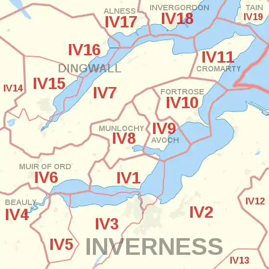 The IV postcode area, also known as the Inverness postcode area,[2] is a group of 52 postcode districts for post towns: Achnasheen, Alness, Avoch, Beauly, Bonar Bridge, Cromarty, Dingwall, Dornoch, Elgin, Fochabers, Forres, Fortrose, Gairloch, Garve, Invergordon, Inverness, Isle of Skye, Kyle, Lairg, Lossiemouth, Muir of Ord, Munlochy, Nairn, Plockton, Portree, Rogart, Strathcarron, Strathpeffer, Strome Ferry, Tain and Ullapool in north Scotland.