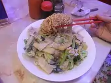 Ifumi is an Indonesian crispy deep fried thick noodle dish, popular in Maritime Southeast Asia, served in a thick savoury sauce with pieces of meat or seafood and vegetables. The dishes are to be served hot while the noodles are still crisp until the noodles are softened by the sauce and are ready to be eaten. The dish is one of the most popular noodle dishes in Chinese Indonesian cuisine.[1] The type of noodle being used in this dish is the thick yi mein noodle, hence the origin of its name. It is quite similar to mie kering noodles from Makassar.