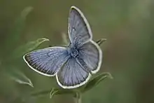 The Puget blue is a small blue and grey butterfly with a wingspan of around 1.8 inches (4.6 cm) in the family Lycaenidae. The male has dorsal wings that are a silvery blue with a wide dark margin. The female is grey brown with diffuse blue patches at the base of the wings, with chocolate brown inner wings.[3] The range of this subspecies spans from Vancouver Island and the Olympic Mountains in alpine to subalpine habitat to the lowland prairies of the South Puget Sound.