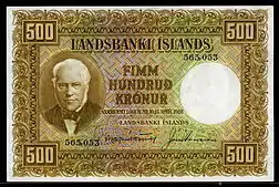 ![]() 500-krónur bill (1928) of the first Icelandic krona, featuring the image of Jon Sigurdsson | |