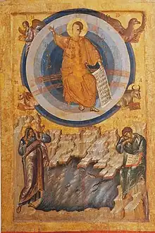 Another interpretation is that the icon represents the Resurrection of Jesus.[11] Through prophecies, Habakkuk foretold the resurrection. These resurrectional prophecies were made popular by Saint Gregory Nazianzus' Second Oration for Easter. This leads researchers who assume a natural origin for the icon to theorize that it was made because of the popularity that Saint Gregory brought to Habakkuk.[18] The figure of Ezekiel also lends itself to this interpretation since he also has resurrectional prophecies.