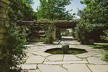 The Meditation Garden is located to the east of the brick road and north of the old Children's Garden. This space has flowing water and a pond. The shade cover present in the Garden provides a cool respite with the shaded areas adjusting temperatures in the space by up to 20 degrees cooler than open areas in the afternoon sun. The Meditation Garden features a collection of broadleaf evergreens, conifers, and deciduous plants that thrive in shade, cool and moist air. The trees in the Garden Woods area were planted in the 1960s by minimum-security inmates from the Old State Penitentiary when it was part of the prison nursery. On the Garden’s opening day, JR Simplot planted a Red Oak that still stands to this day. The sandstone quarried on Table Rock by the prisoners constructs the back wall of the Garden Woods. The space provides picnic tables for visitors as well.