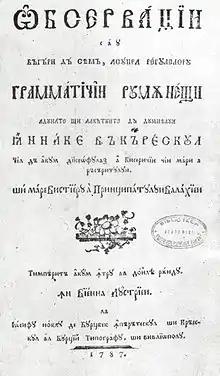 Văcărescu wrote one of the first printed books on Romanian grammar in 1787, an edition which also included a section dedicated to the study of prosody; it was titled Observaţii sau băgări de seamă asupra regulilor şi orânduielilor gramaticii româneşti ("Observations or Reckonings on the Rules and Dispositions of Romanian Grammar"). He also completed a work on Greek grammar (Gramatica greacă completă).
