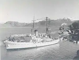 The USCGC Comanche, after which the fjord was named, anchored at Ivittuut.