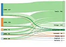 A graphical representation of Ilaiyaraaja's discography over the years with colours to represent languages