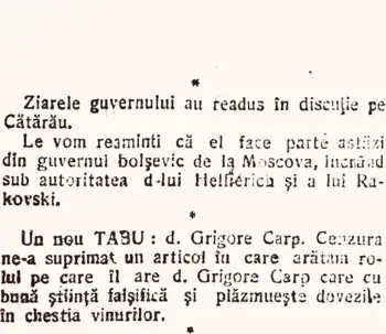 As later noted by Patria, the Transylvanian daily, Cătărău was becoming "a sort of dictator who terrified the city".[10] In conflict with Sfatul Țării, he began organizing himself for an insurgency. He agitated for a social revolution, set up an armed guard for himself, and began corresponding with Kotovsky, who was the self-appointed Bolshevik leader in Tiraspol, while setting up a reserve arms' depot in Dubăsari town.[14][40] His insubordination to the government and his radical views on property were made explicit when he refused to help out against the deserters attacking Soroca. Replying to the appeal for help, Cătărău wrote: "the Moldavian Democracy, in the name of the soldiers of the Moldavian Regiment, understands that the way to stop the anarchy which has arisen in agrarian matters, is not to use military force, but to [legislate against] the causes which give rise to fire and devastation".[41] Nevertheless, when similar events in Chișinău led the Republic to proclaim a state of emergency in December, one of the regimental battalions patrolled the city streets alongside loyalist units.[45]