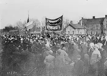 At Iași, Cătărău kept company with other Bessarabian refugees, among them Okhrana informant Alexis Nour.[14] By April 1917, Cătărău had come into contact with the leftist Labor Party, founded by George Diamandy, Nicolae L. Lupu, and Grigore Trancu-Iași.[14] He then left for Bessarabia, where, as a nominal Labor Party representative, he contacted the autonomist National Moldavian Party (PNM). The PNM registered Cătărău's mission as an oddity, and refused to deal with the Romanian leftists.[14] Cătărău returned to Romania as a radical competitor of Laborite politics, and founded his own republican-dictatorial group, the "Romanian Nationalist-Revolutionary Party" (PNRR, also known as the "Group of Romanian Nationalist Revolutionaries"). It had a self-contradictory program, celebrating the glories of "Greater Romania" and "Free Russia".[14][38] This political enterprise counted among its recruits the Bessarabian Simeon G. Murafa,[14] who also brought in Romulus Cioflec as a Transylvanian contact. In his published memoirs, Cioflec provides detail on Cătărău's designs for a revolution in Romania-proper; when asked about whether anyone was helping him from across the Romanian border, Cătărău supposedly hinted that he expected support from Octavian Goga, the nationalist poet.[39] Porsenna, who read one of his manifestos, noted that it urged Romanians to "revolt and join their Russian brethren in an uprising for the sake of liberty".[6] More in detail, the PNRR promised universal suffrage, wealth redistribution, immediate land reform, and application of the homestead principle in agriculture, as well as allusing to a "second point" of policy, which remained unpublished.[38]