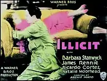 Illicit is a 1931 American pre-Code drama film directed by Archie Mayo and starring Barbara Stanwyck, James Rennie, Ricardo Cortez, and Natalie Moorhead. Based on a play by Edith Fitzgerald and Robert Riskin, the film is about a young couple living together out of wedlock because the woman does not believe in marriage. When they finally get married, both become unfaithful to each other. Illicit was produced and distributed by Warner Bros.[1]