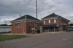 The former depot is a 2½-story brick structure on a limestone foundation, and capped with a hipped roof. It was designed by the architects of the Illinois Central Railroad.[2] The interior featured two waiting rooms on the first floor, one for the men and one for women. Office's for the IC's division headquarters occupied the second floor. The exterior of the building was altered in the 1940s. The canopy over the old platform is a reconstruction of the original. The American Express building is a single story brick structure built on a concrete and limestone foundation. It too was capped with a hipped roof. This building was altered in 1922. Both buildings are located next to each other along South Fourth Street.