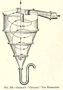 As extremely finely divided particles were also suspended in the gas, it was impossible to separate the particulate matter solely by a reduction of vapor pressure. The gas underwent processes to remove all traces of solid or liquid matter before it reached the wet purification plant. Centrifugal separators, such as the Colman Cyclone apparatus were utilized for this process in some plants.