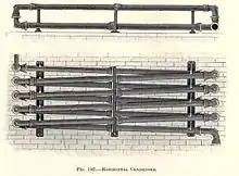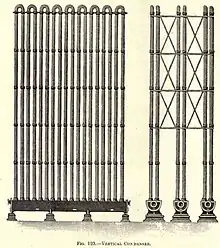 The horizontal condenser was an extended foul main with the pipe in a zigzag pattern from end to end of one of the retort-house walls. Flange connections were essential as blockages from naphthalene or pitchy deposits were likely to occur. The condensed liquids flowed down the sloping pipes in the same direction as the gas. As long as gas flow was slow, this was an effective method for the removal of naphthalene. Vertical air condensers had gas and tar outlets.