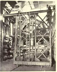 This large-scale gas meter precisely measured gas as it issued from the works into the mains. It was of the utmost importance, as the gasworks balanced the account of issued gas versus the amount of paid for gas, and strived to detect why and how they varied from one another. Often it was coupled with a dynamic regulator to keep pressure constant, or even to modulate the pressure at specified times (a series of rapid pressure spikes was sometimes used with appropriately equipped street-lamps to automatically ignite or extinguish such remotely).