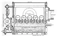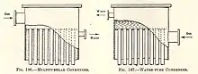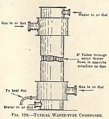 The battery condenser was a long and narrow box divided internally by baffle-plates which cause the gas to take a circuitous course. The width of the box was usually about 2 feet, and small tubes passed from side to side form the chief cooling surface. The ends of these tubes were left open to allow air to pass through. The obstruction caused by the tubes played a role in breaking up and throwing down the tars suspended in the gas.