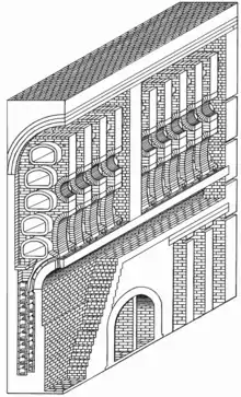 - The introduction of heat recuperation for the preheating of the air of primary and secondary combustion. By causing the exhaust of the retort-bench to pass through a maze of refractory brickwork, substantial quantities of heat can be extracted from it. On the other side of the exhaust channels are channels for the passage of the air of combustion. The bricks thus transfer the heat of the exhaust to the air of combustion, preheating it. This provides for a much greater degree of thermal efficiency in the retort-bench, causing it to be able to use far less coke, since air that is preheated by waste heat is already hot when it enters the fire to be burnt, or the "tuyere" to fuel secondary combustion.