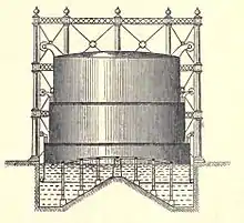 Gasholders were constructed of a variety of materials, brick, stone, concrete, steel, or wrought iron. The holder or floating vessel is the storage reservoir for the gas, and it serves the purpose of equalizing the distribution of the gas under pressure, and ensures a continuity of supply, while gas remains in the holder. They are cylindrical like an inverted beaker and work up and down in the tank. In order to maintain a true vertical position, the vessel has rollers which work on guide-rails attached to the tank sides and to the columns surrounding the holder.