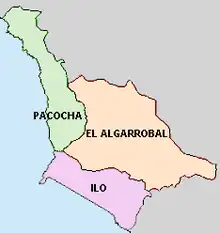 The Ilo Province is divided into three districts (Spanish: distritos, singular: distrito), each of which is headed by a mayor (alcalde). The districts, with their capitals in parentheses, are: