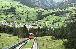 Iltiosbahn is a funicular railway in the Canton of St. Gallen, Switzerland. It leads from Unterwasser at 911 m to Iltios at 1339 m,[2] from where an aerial cableway continues to Chäserrugg (2262 m), a peak of the Churfirsten range above Lake Walen. The line has a length of 1195 m with a maximum incline of 27% and a difference of elevation of 428 m.[2]