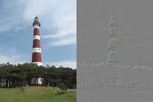 The emboss filter, also called a directional difference filter,[1] will enhance edges in the direction of the selected convolution mask(s). When the emboss filter is applied, the filter matrix is in convolution calculation with the same square area on the original image. So it involves a large amount of calculation when either the image size or the emboss filter mask dimension is large. The emboss filter repeats the calculation as encoded in the filter matrix for every pixel in the image; the procedure itself compares the neighboring pixels on the image, leaving a mark where a sharp change in pixel value is detected. In this way, the marks form a line following an object's contour. The process yields an embossed image with edges highlighted.