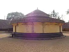 The temple is built in Kerala style architecture, common in all temples in the South Indian state of Kerala in Eastern axis. The temple has no gateway tower and has an arch from the main road. A rectangular wall around the temple, called Kshetra-Madilluka pierced by the gateways, encloses all the shrines of the temple. The metal plated flagpost or dvajasthambam is located axial to the temple tower leading to the central sanctum. Chuttuambalam is the outer pavilion within the temple walls. The central shrine and the associated hall is located in a rectangular structure called Nallambalam, which has pillared halls and corridors.[8] Between the entrance of Nallambalam to the sanctum, there is a raised square platform called Namaskara Mandapa which has a pyramidal roof. Thevrapura, the kitchen used to cook offering to the deity is located on the left of Namaskara Mandapa from the entrance. Balithara is an altar is used for making ritualistic offering to demi-gods and the festive deities. The central shrine called Sreekovil houses the image of the presiding deity. It is on an elevated platform with a single door reached through five steps. As per Kerala rituals, only the main priest called Thantri and the second priest called Melshanthi alone can enter the Sree Kovil.[9] The central shrine has a circular plan with the base built of granite, superstructure built of laterite and conical roof made of terrocata tile supported from inside by a wooden structure.[10] The image of the presiding deity is 4 ft (1.2 m) tall. Krishna is in his vishvarupa pose, the one he depicted to Arjuna during the Kurukshetra War.[11] In the second precinct, there are shrines of Sastha, Yakshi, Nagaraja and Erangavil Bhagavathy Balarama in the lower shrine.[11]