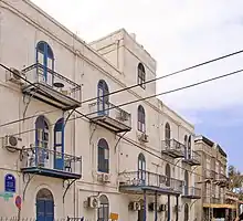 Ustinov's former Hôtel du Parc (left) and Hardegg's former Hotel Jerusalem (right), façades towards Rechov Auerbach (רחוב אוארבך)