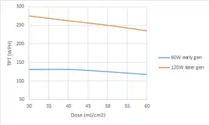 As of 1996, this was achieved through higher stage speeds,[11][12] which in turn, as of 2013 were allowed by higher power ArF laser pulse sources.[13] Specifically, the throughput is directly proportional to stage speed V, which is related to dose D and rectangular slit width S and slit intensity Iss (which is directly related to pulse power) by V=Iss*S/D. The slit height is the same as the field height. The slit width S, in turn, is limited by the number of pulses to make the dose (n), divided by the frequency of the laser pulses (f), at the maximum scan speed Vmax by S=Vmax*n/f.[11] At a fixed frequency f and pulse number n, the slit width will be proportional to the maximum stage speed. Hence, throughput at a given dose is improved by increasing maximum stage speed as well as increasing pulse power.