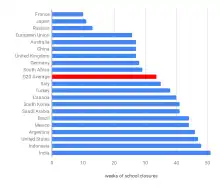 The COVID-19 pandemic affected educational systems across the world.[1] The number of cases of COVID-19 started to rise in March 2020 and many educational institutions and universities underwent closure. Most countries decided to temporarily close educational institutions in order to reduce the spread of COVID-19. UNESCO estimates that at the height of the closures in April 2020, national educational shutdowns affected nearly 1.6 billion students in 200 countries: 94% of the student population and one-fifth of the global population. Closures are estimated to have lasted for an average of 41 weeks (10.3 months). They have had significant negative effects on student learning, which are predicted to have substantial long-term implications for both education and earnings. During the pandemic, education budgets and official aid program budgets for education have decreased.[2][3][4][5][6]