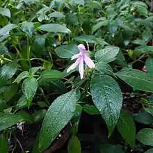 Impatiens johnii is a species of balsam with a restricted distribution in the Munnar region of southern India. The species was first described by Edward Barnes in 1939 and it was not recorded in the wild again until 1999.[2] The species has a restricted geographic distribution and is therefore considered endangered. It is known from the Pettimudy area and flowers from September to December.[3]