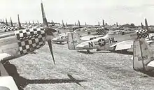 In March 1943 the United States Army Air Forces' 78th Fighter Group started to arrive at Duxford with their Republic P-47 Thunderbolts. The Group reequipped with North American P-51 Mustangs in December 1944 and until the end of the war in Europe the Group remained at Duxford carrying out bomber escort and fighter sweeps, ground strafing and ground attack missions.[17] Duxford was officially returned to the RAF on 1 December 1945. It remained a fighter station but by 1958 changing defence priorities saw the RAF's fighter force move to more northerly bases. Duxford's last operational flight was made in July 1961. No longer operational, the site gradually became increasingly derelict and overgrown. In 1968 the American film studio United Artists obtained permission to use the site for the filming of Battle of Britain. During the shoot a single bay hangar, which had been built during the First World War, was demolished to simulate an air raid.[18] After the Ministry of Defence announced its intention to dispose of Duxford plans were drawn up for various developments including two Young Offenders Institutes but were not implemented.[19]