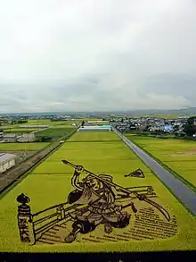 In 1993, as part of a revitalization effort, Inakadate began creating rice paddy art, murals of art using rice paddy fields. The people were looking for a way to revitalize their village. Archaeology showed that rice had been grown in the area for more than 2000 years.[5] To honor this history, the villagers started a rice field behind the town hall. The villagers cultivated and used four different types[5] of heirloom and modern strains of rice to create a giant picture in the field. To allow viewing of the whole picture, a mock castle tower 22 meters high was erected at the village office.[5] In 2006, more than 200,000 people visited the village to see the art.[5]