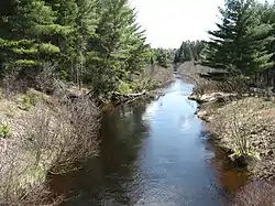 The river begins at an unnamed lake in the southeast corner of Algonquin Provincial Park, in geographic Master Township in the Unorganized South Part of Nipissing District.[2] It flows north, then turns southeast at the point where it takes in the left tributary Walker Creek, 500 metres (1,640 ft) from the railway point of Kathmore. From this point, the river valley is used as the route of the now abandoned Canadian National Railway Beachburg Subdivision, a section of track that was originally constructed as the Canadian Northern Railway main line. The river passes the railway point of Dahlia, and leaves the park and Nipissing District to enter Renfrew County, at geographic Richards Township in the municipality of Killaloe, Hagarty and Richards. After only 1,100 metres (3,600 ft), it passes into geographic Fraser Township in the municipality of Laurentian Valley, then reaches the unincorporated place and railway point of Indian. It continues east, loops under Renfrew County Road 58, and reaches the community of Alice. It flows again under Renfrew County Road 58, then Renfrew County Road 26 at the community of Davis Mills, and under Ontario Highway 17, at this point part of the Trans-Canada Highway. The river enters the city of Pembroke, and reaches its mouth at the Muskrat River, just before that river reaches its own mouth at the Ottawa River.