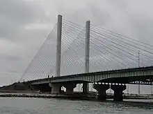 The Indian River Inlet Bridge is a cable-stayed bridge, consisting of four pylon towers with 152 stays supporting the bridge.[2] The pylons are located on land in order to avoid erosion from the inlet.[4] The bridge has a total length of 2,600 feet (790 m) and a total width of 107.66 feet (32.81 m). The span of the bridge is 950 feet (290 m) with an overhead clearance of 45 feet (14 m). The height of the pylon towers is 247.5 feet (75.4 m) above sea level.[5] The bridge has a fiber-optic system that monitors it for issues that could affect its structural integrity. The bridge is designed to last 100 years.[6]