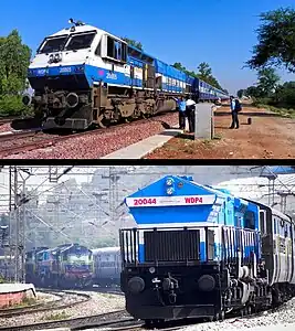 The Indian locomotive class WDP-4 (EMD GT46PAC) is a passenger-hauling diesel-electric locomotive with AC electric transmission designed by General Motors Electro-Motive Division and built by both GM-EMD and under license by Banaras Locomotive Works (BLW) of Varanasi, India for Indian Railways as the classes WDP4, WDP4B and WDP4D.[1] The GT46PAC is a passenger version of the previous Indian Railways EMD GT46MAC freight locomotive. The locomotive has a 16-cylinder 710G3B diesel engine and is one of the fastest diesel-electric locomotives in service in Indian Railways.[2]