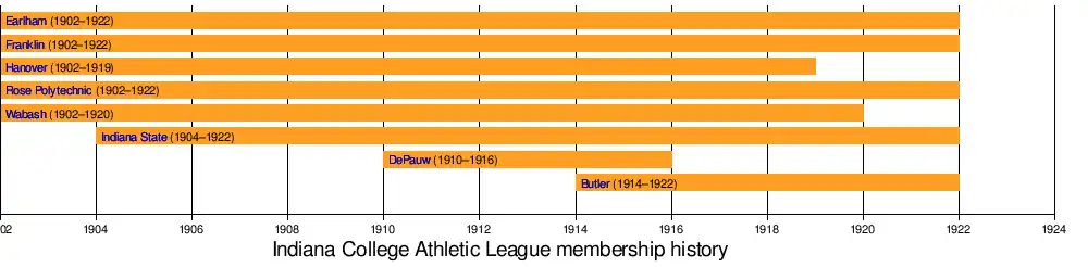 The ICAL was founded on December 13, 1902, in a meeting held at the Denison House Hotel in Indianapolis, concurrent with the annual meeting of the IIAA, which had convened at a nearby location. The founding members were Earlham, Franklin, Hanover, Rose Polytechnic, and Wabash.[2] Of the five, Franklin and Hanover had already quit the IIAA. Earlham likewise left the IIAA in 1903, while Rose Polytechnic and Wabash remained active members of both organizations until 1907. Indiana State joined the ICAL in 1904.[3] DePauw joined in 1910, one year after leaving the IIAA,[4] while Butler joined in 1914,[5] eleven years after leaving the IIAA. With the addition of Butler, the ICAL reunited all former members of the IIAA except the state's "big three" major college programs: Indiana, Purdue, and Notre Dame.