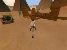 Developed for Windows 95 and 98,[34] the game uses a modified version of the Sith engine adapted for a third-person view by lead programmer Paul LeFevre.[35] Eventually, lighting, collision, rendering and tools underwent drastic rewrites to the point that the code was renamed the Jones engine.[35] The levels were principally designed by Steven Chen, and later conceptualized with illustrations by lead artist William Tiller.[36] Multiplayer support was planned at the beginning of the development, but ultimately dropped because it turned out to be too complex to adequately test.[35] Instead, more emphasis was put on the design of the single-player campaign with its puzzles and exploring aspect.[35] The team implemented a hint system to lead players in the right direction.[33] Additionally, the score system from previous Indiana Jones games, the Indy Quotient, makes a return.[37] Apart from John Williams' "Raiders March", the soundtrack was newly composed by Clint Bajakian and consists of about 130 original pieces.[35] Dubbed European language versions of the fully voice-acted game were released by THQ in Germany, Ubisoft in France, Electronic Arts in Spain and CTO in Italy.[38][39][40][41]
