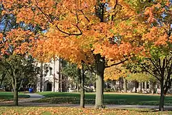 Much of the decidious forests that once covered 98% of the region were cleared for agriculture and urban development, contributing to considerable habitat loss.[131][92] Indianapolis's current urban tree canopy averages approximately 33%.[133] A rare example of old-growth forest in the city can be found on 15 acres (6.1 ha) of Crown Hill Cemetery's North Woods in the Butler–Tarkington neighborhood.[134] The cemetery's 555 acres (225 ha) represents the largest green space in Center Township, home to an abundance of wildlife and some 130 species of trees.[135] Native trees most common to the area include varieties of ash, maple, and oak.[131] Several invasive species are also common in Indianapolis, including tree of heaven, wintercreeper, Amur honeysuckle, and Callery pear.[136][137]