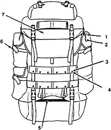 Pack, Patrol, Combat - The combat patrol pack is designed for short missions and offers 1200 cubic inches of cargo space in two compartments. The main compartment is padded to protect the back from heavy, sharp items. The main compartment incorporates two tiedown straps that can be used to stabilize equipment such as a field radio. The combat patrol pack has a separate shoulder harness. When used in combination with either the ammunition carrying or tactical load-carrying vests, the combat patrol pack shoulder pads are worn over the vest shoulder pads, and retained for stability by two one inch [2.54 cm] pieces of webbing. The combat patrol pack can also be used in conjunction with the field pack. With the "LCS-88" experimental version, the patrol pack attached directly to the shoulder straps of the LBV, and a waist belt was used to keep it from bouncing around.
